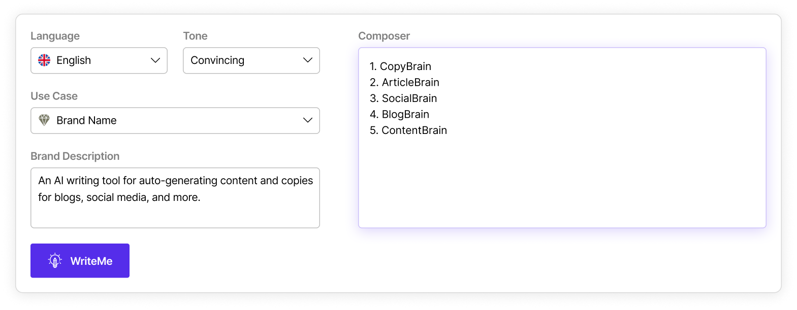 Input some relevant information such as brand description to the brand names generator. Finally, simply click WriteMe!